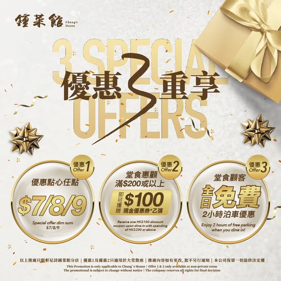 如果计划与家人或朋友共进一顿丰盛的中餐,这项优惠绝对是大好消息! 在钟菜馆湾仔分店堂食满$200,即可获赠两张$100现金优惠券,用于下次消费。 这样的折扣安排,不仅让此次用餐变得更经济,还为下次聚餐提供了诱人的理由。 不妨趁着这次机会,点多几道招牌菜式,如烧鹅、龙虾等,与亲朋好友一同享受中菜的美味盛宴。