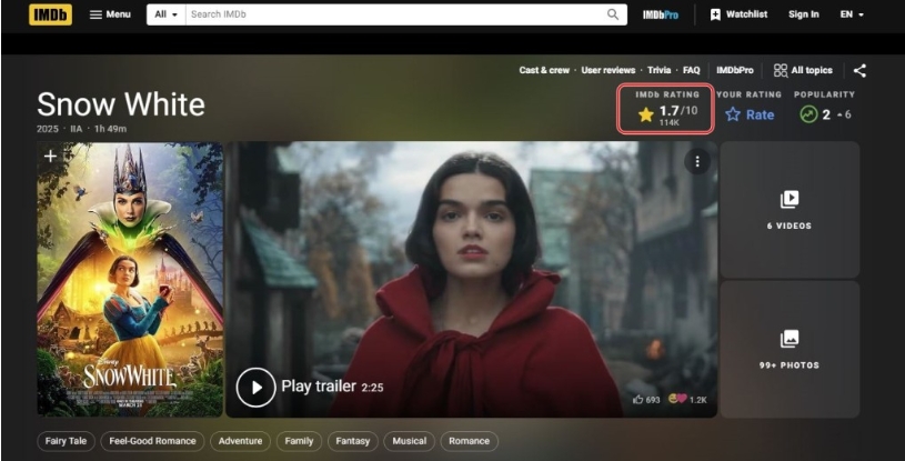 迪士尼真人版《白雪公主》上周末上映,北美知名的电影网站IMDb今天显示10万余用家的评分,10分满分仅得1.7分! 如此低的评分,在IMDb极为少见。 尤其是,这是一部投资2.5亿美金的超级大片。