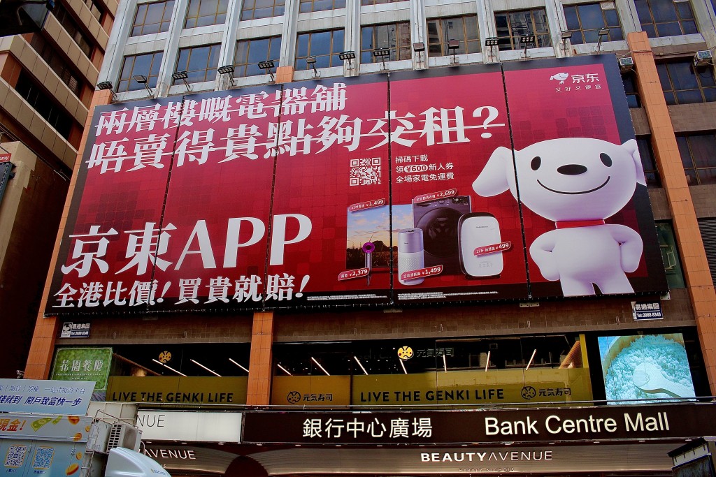 京东更用金钱攻势,在闹市投放多幅巨型广告牌,疑向大型电器铺“挑事”,标语包括“两层楼嘅电器铺,唔卖得贵点够交租(两层楼的电器铺,不卖得贵怎么够交租)”、“又平!又有售后服务!唔知人哋做唔做到(不知道别人做不做得到)?”、“我哋冇明星卖广告,但我哋有坏包换新(我们没有明星卖广告,但我们有坏包换新)”等等。
