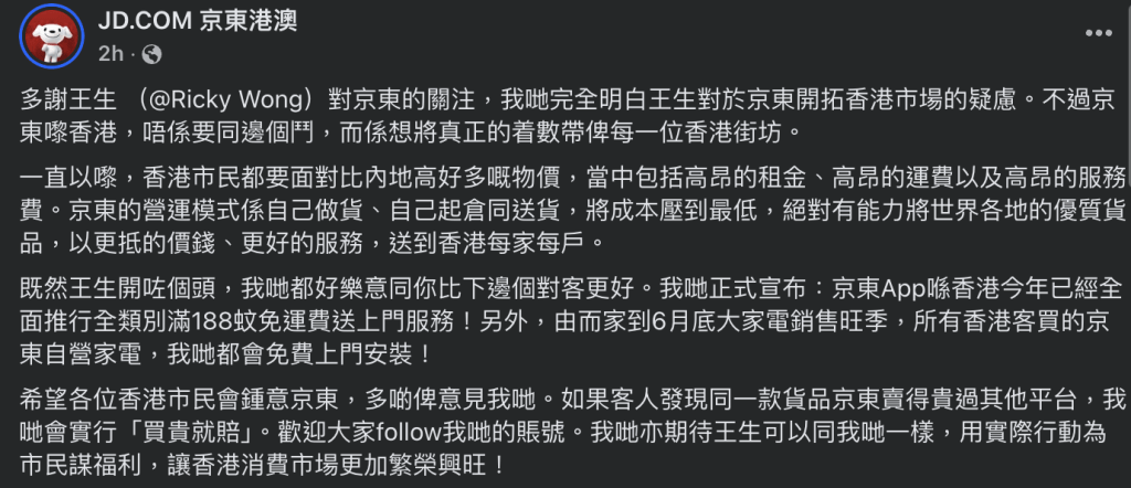 希望各位香港市民会喜欢京东,多给我们意见。如果客人发现同一款货品京东卖得贵过其他平台,我们会实行“买贵就赔”。 欢迎大家follow我们的账号。 我们亦期待王先生能和我们一样,用实际行动为市民谋福利,让香港消费市场更加繁荣兴旺!”