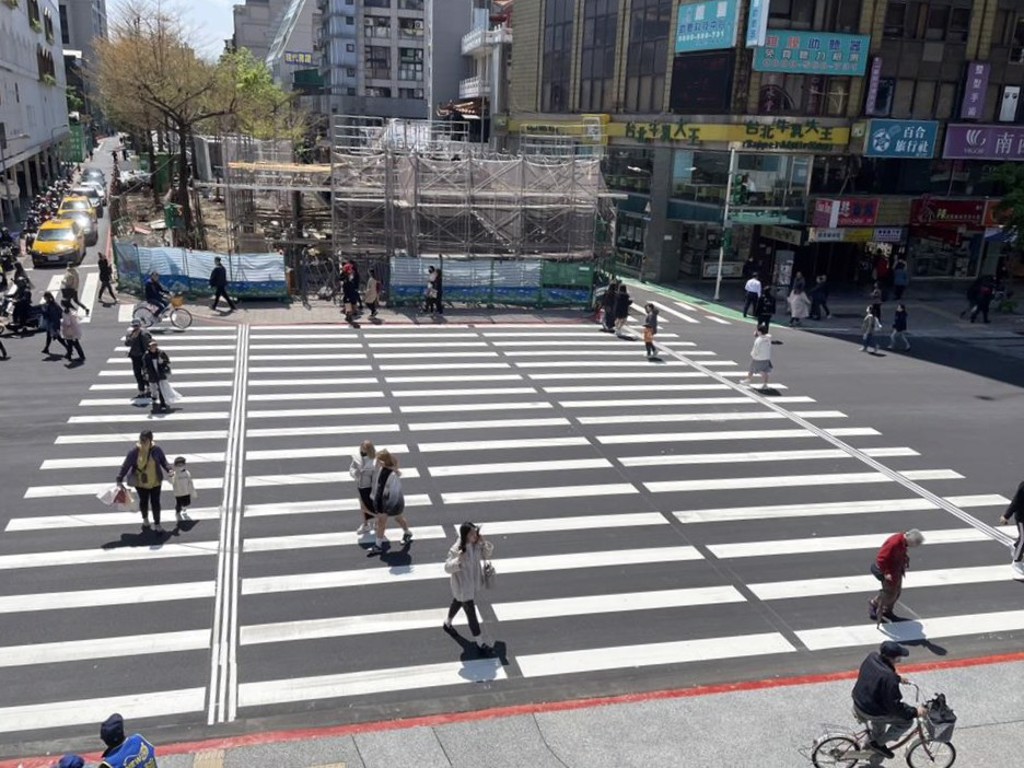 台北捷运中山站1、4号出口外的大马路近日画设20公尺宽的行穿线,并刨除两侧的斑马线,让不少网友惊呼,宽广的行穿线让街景宛如日本涩谷十字路口,因此被称为“台北涩谷”,但仅实施才8天,两侧的斑马线又被重新画回,一名女子发现后,将其拍下PO上网,网友们纷纷感叹“从日本涩谷打回台湾”。对此北市长蒋万安表示,考量行人仍有使用两侧斑马线的需求,才会要求交通局复原。
