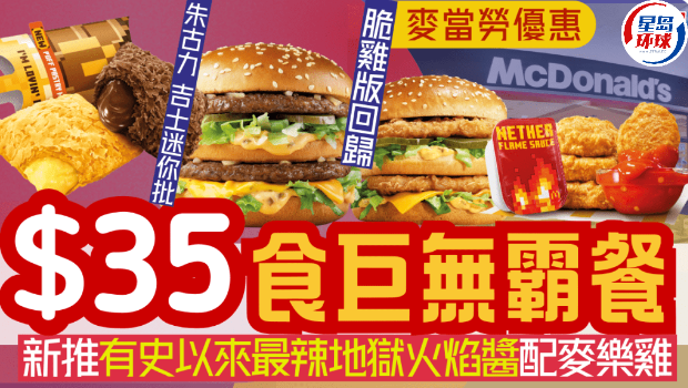 麦当劳x姜涛@MIRROR推巨无霸优惠兼做善事!麦当劳再度推出超值优惠,同时支持公益行动,由3月27日起,凭$35即可享用巨无霸或脆鸡巨无霸套餐,同时每售出一份,麦当劳即会捐$1予香港麦当劳叔叔之家慈善基金,助力有需要的病童家庭。 此外,多款期间限定新品如地狱火焰酱、迷你酥皮批等同步登场,为顾客带来崭新美食体验!
