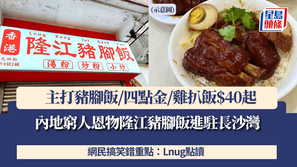 近年不少内地餐饮品牌南下来港开店,港人毋须北上都可享用内地各种特色美食,如绿茶餐厅、太二老坛子酸菜鱼、陈鹏鹏潮汕菜馆等。 近日,有网民于网上群组分享,发现内地平价隆江猪脚饭进驻长沙湾,并预计将于3月尾开张,惟餐点定价贵近3倍,有网民则搞笑将重点放错于招牌的英文拼音:“Lnug点读?”