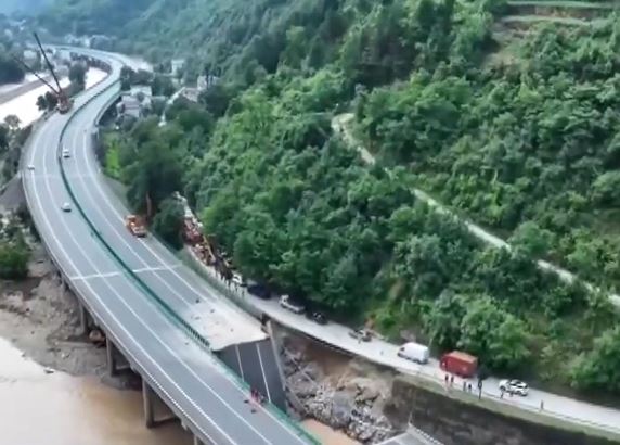 ▲陕西商洛市柞水县境内的高速公路桥梁垮塌。