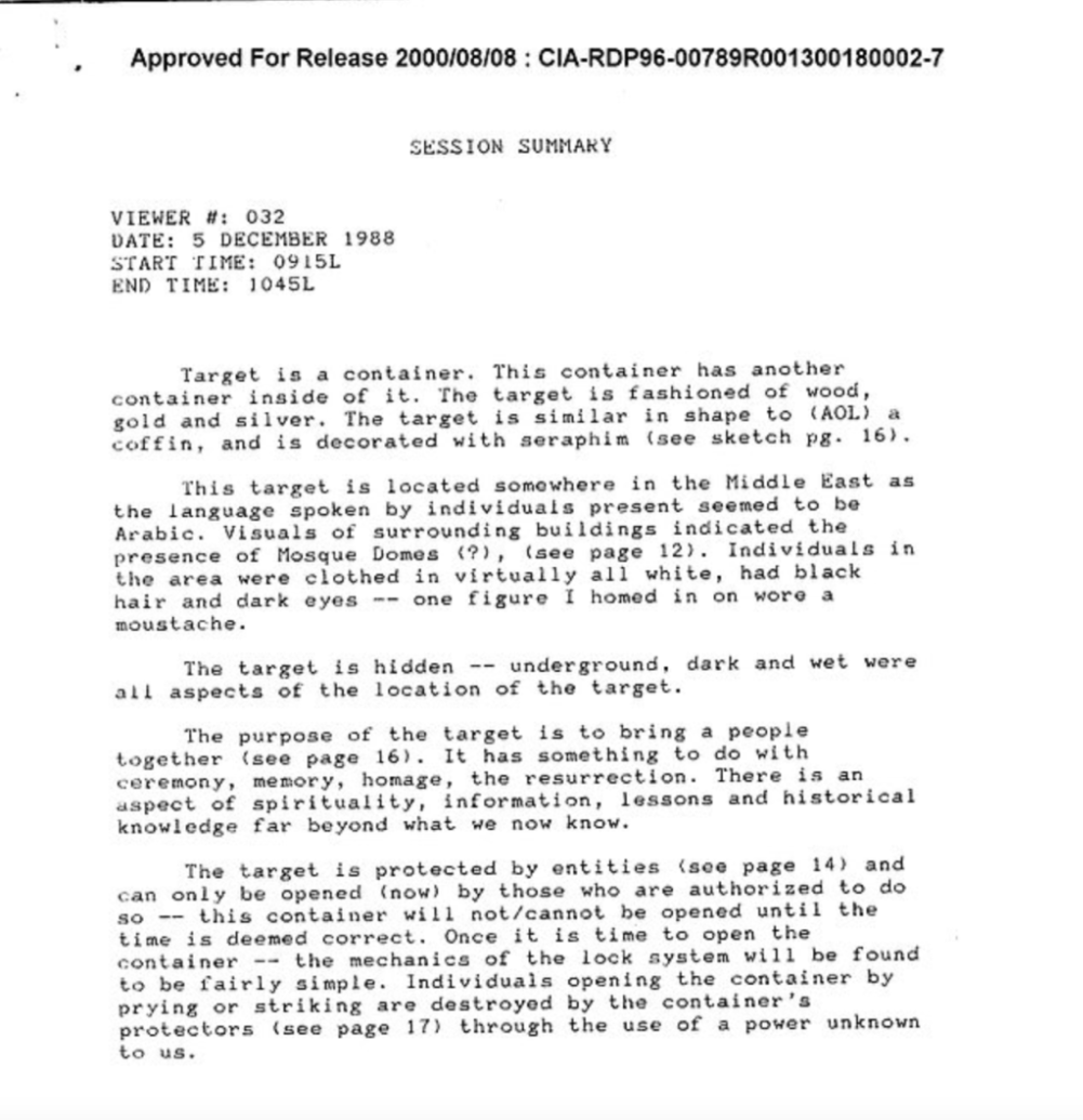 根据英媒每日邮报报道,这份CIA文件记载,一名代号为“遥视者032”的实验对象,在未被告知目标物的情况下,只根据一组坐标进行遥距搜寻,并声称看到一个“棺材状容器”藏于中东某地的地下空间中。 该容器由木、金与银制成,外部刻有六翼天使图腾,周遭湿冷昏暗,有人讲阿拉伯语,衣着洁白,建筑则为圆顶清真寺式样。