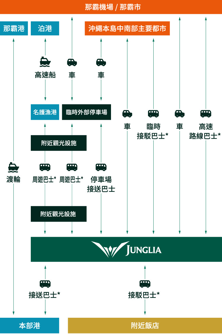 乐园位于今归仁村与名护市交界处,距离冲绳美丽海水族馆不远,由冲绳那霸机场出发,开车约1小时30分钟。 此外,高速巴士路现正进行规划中,部分合作酒店预计亦会提供接驳巴士,有计划前往的旅客记得留意最新消息!
