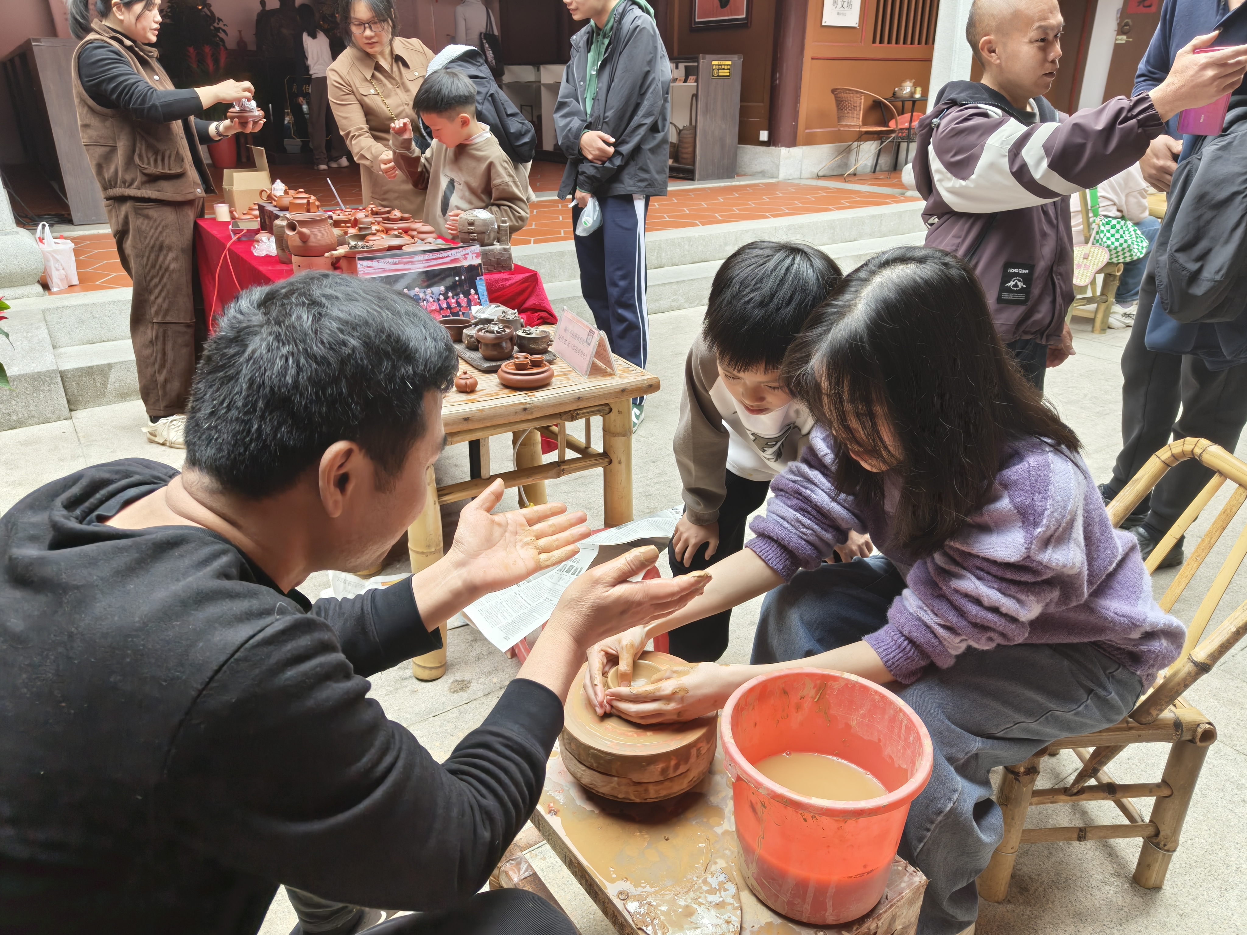 ▲游客体验手拉壶制作。
