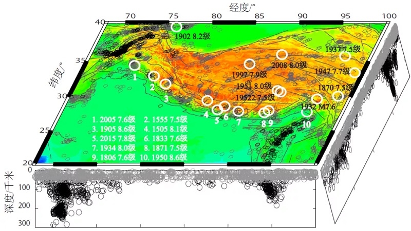 ▲喜马拉雅-青藏高原地区发生的震级大于7.5级、深度小于70千米的地震。 中科院