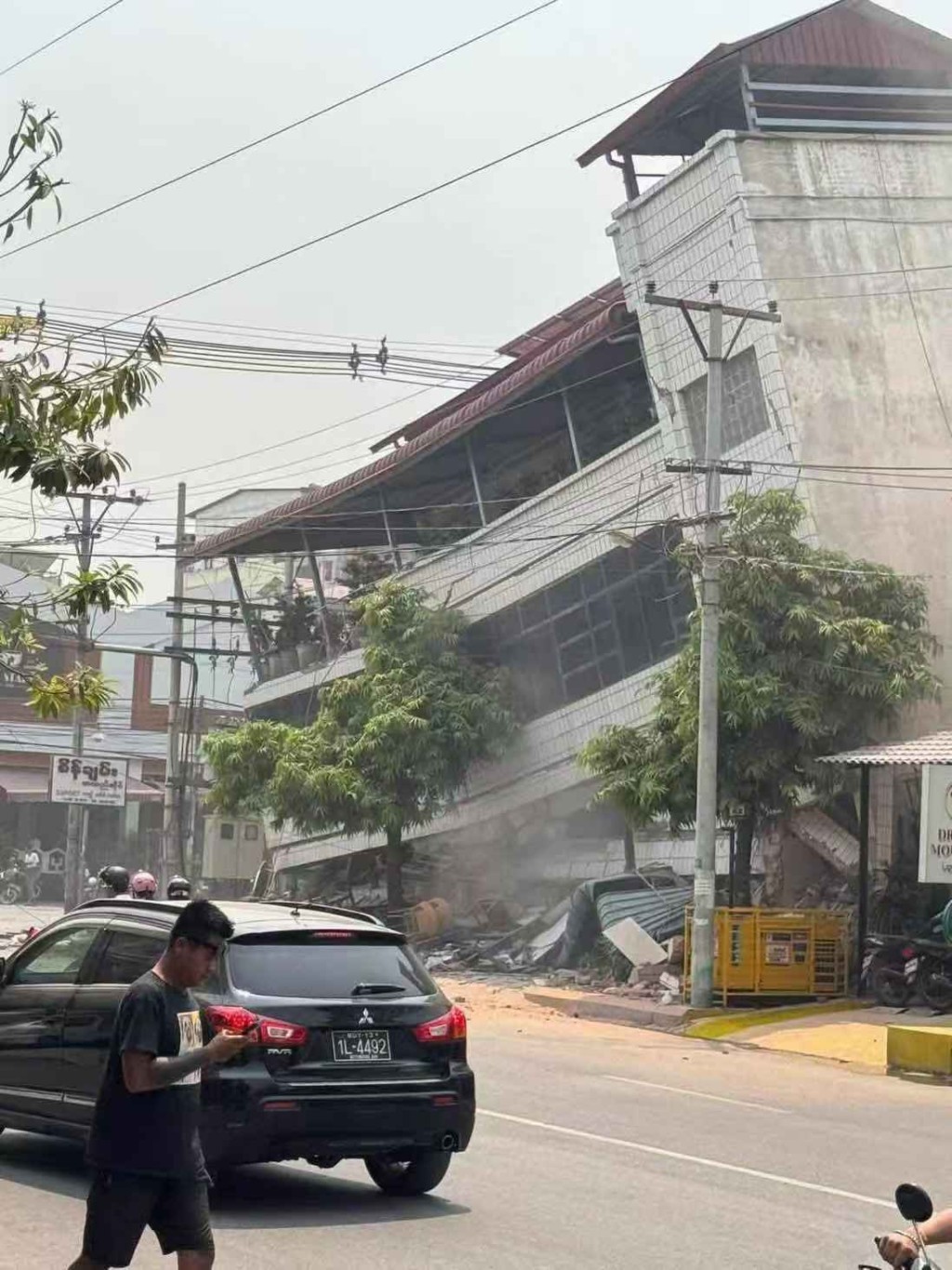 “轰隆一声,整条街的酒店像积木一样塌了!”在缅甸曼德勒翡翠市场附近做生意的华人小康(化名),用颤抖的声音描述了3月28日下午的恐怖场景。地震发生时,小康正站在街头,亲眼目睹了灾难的全过程:“第一次震动持续了1分钟,马路像波浪一样起伏,人根本站不稳。紧接着又是一波余震,几十栋酒店轰然倒塌,灰尘遮天蔽日。”他所在的酒店外墙已严重倾斜,蓝色楼体歪斜着隔壁商铺,而那里住的几乎都是来缅甸做玉石生意的中国人。
