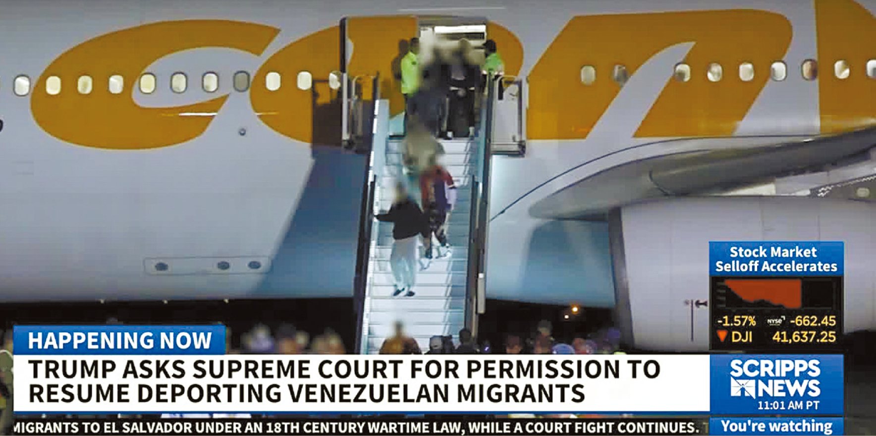 ▲特朗普政府目前仍可执行其他移民的驱逐航班,但针对被指属委内瑞拉黑帮“阿拉瓜火车”的成员移民航班,暂时叫停。 电视截图