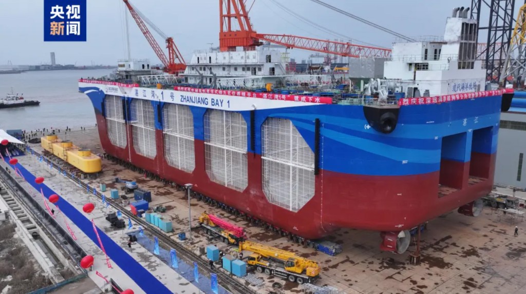 央视新闻客户端消息,3月28日,全球首艘漂浮式动力定位全局化网箱型工船“湛江湾一号”在江苏南通通州湾示范区成功下水。