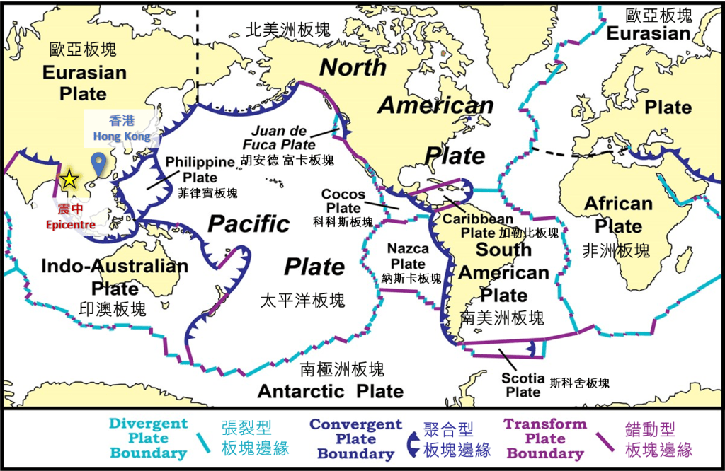 ▲全球构造板块分布图,黄色星标示了2025年3月28日缅甸7.6级地震的震中。天文台网页