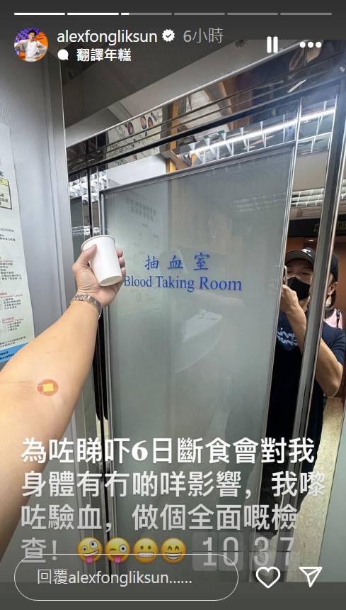 到翌日起床,方力申就现身于诊所门外,原来他要验血:“为咗睇吓6日断食会对我身体有冇啲咩影响,我嚟咗验血,做个全面嘅检查”于图片所见,戴上Cap帽、穿上蓝色短Tee的方力申左前臂贴上胶布,已完成抽血进程。