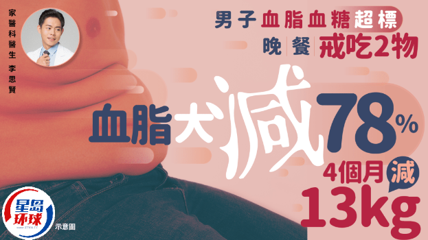 一名男子因超重求医,医生发现他的血脂、血糖等多项指数超标。不过,自他听从医生吩咐在晚餐戒吃2种食物后,不但成功在4个月减去13kg,血脂更大降78%。