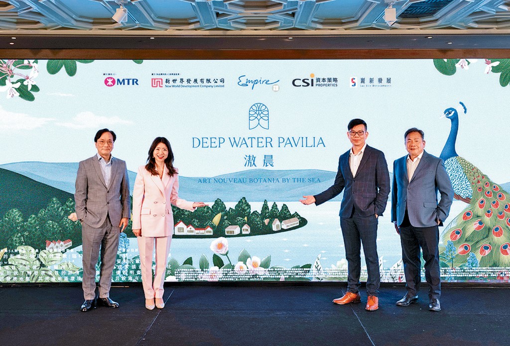 ▲新世界何家欣(左二)表示,公司牵头发展的黄竹坑站滶晨料于第二季内开售。右二为帝国姚志伟、左一为资本策略何乐辉、右一为丽新潘锐民。