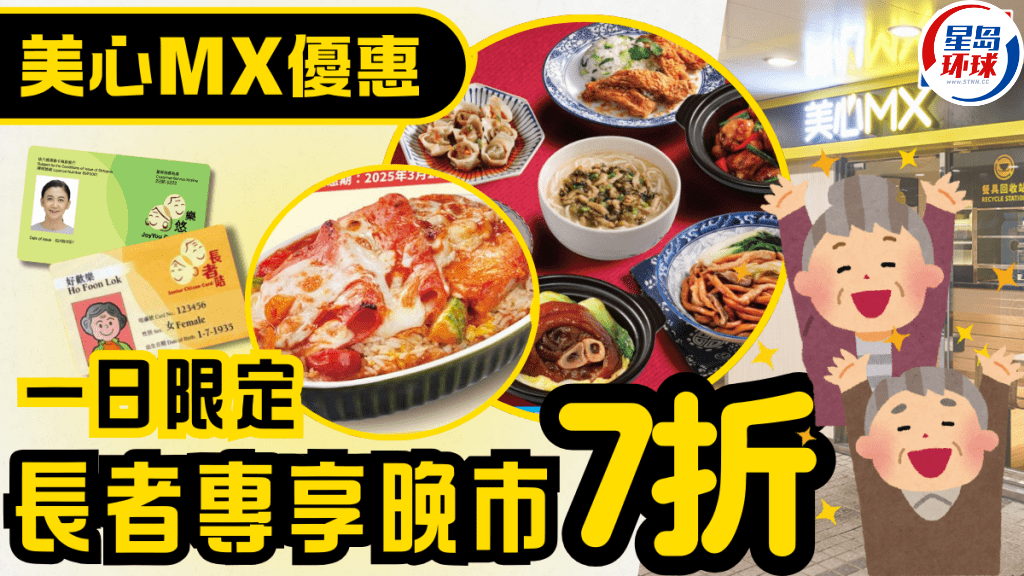美心长者优惠又来了!美心MX与美心Food²特别推出每月一次的长者专属优惠,4月3日(星期四)将再次为长者朋友带来晚市7折的惊喜!凡持有长者咭、乐悠咭等合资格证件,即可于当日下午5时起享受堂食或外卖7折优惠,让老友记以更实惠的价格享受丰富美味的餐点!