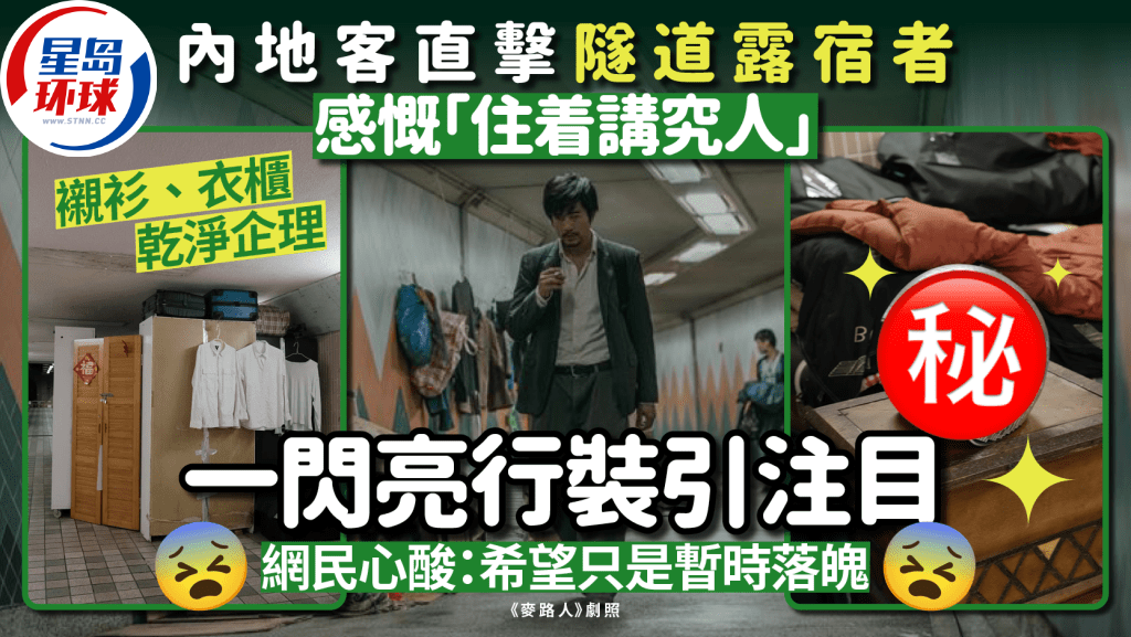 大城市内有各种阶层人士,有人或出于各种原因导致居无定所,需要在街上露宿,各区不起眼的一角随时成为他们的“家”。有内地旅客于网上分享早前来港旅游,在一处地下行人隧道中,看到露宿者自成一角的“居所”令他大感震惊,意外认为他们讲究整洁,连挂起的衬衫亦是干净,感慨“住着讲究人”,引起网民无比心酸,希望露宿者“只是暂时落泊”。
