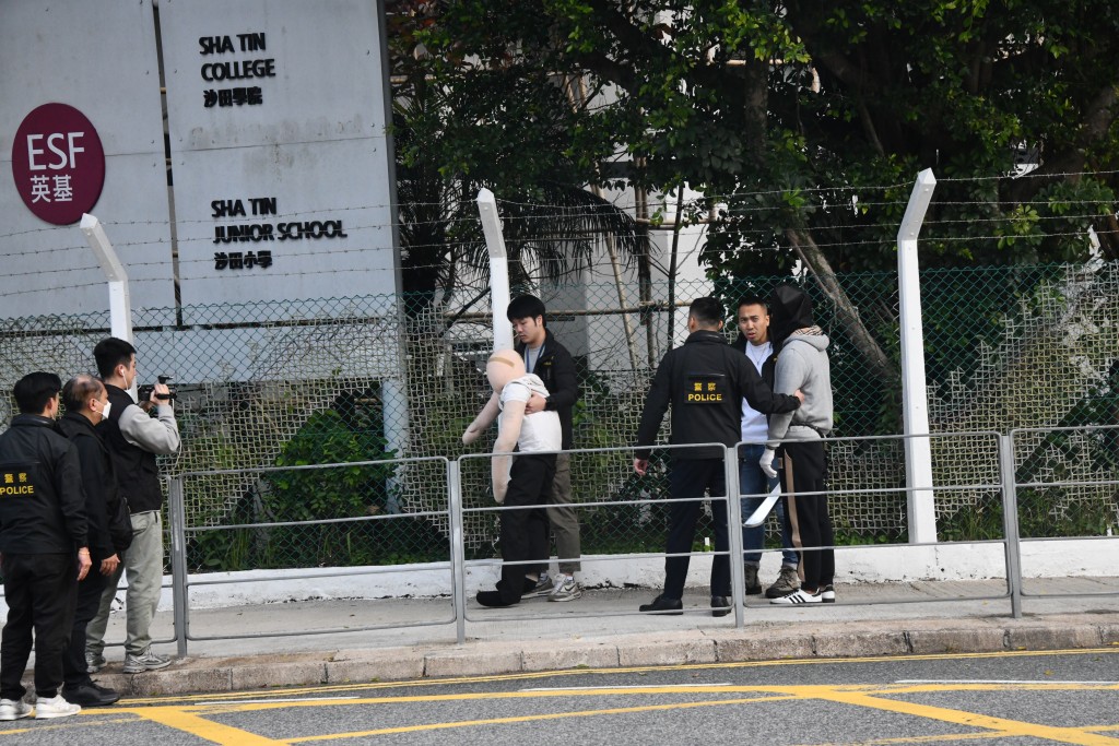 今日(2日)下午4时,警方将疑犯押解回案发现场进行重组案情。疑犯身穿灰色长袖衫及黑色长裤,双手戴上白色手套,黑布蒙头、腰缠铁链。他在两名探员左右押解下,于丽禾里回旋处交代事发经过,之后指示行凶路线,现场有警员在前方拍摄纪录。