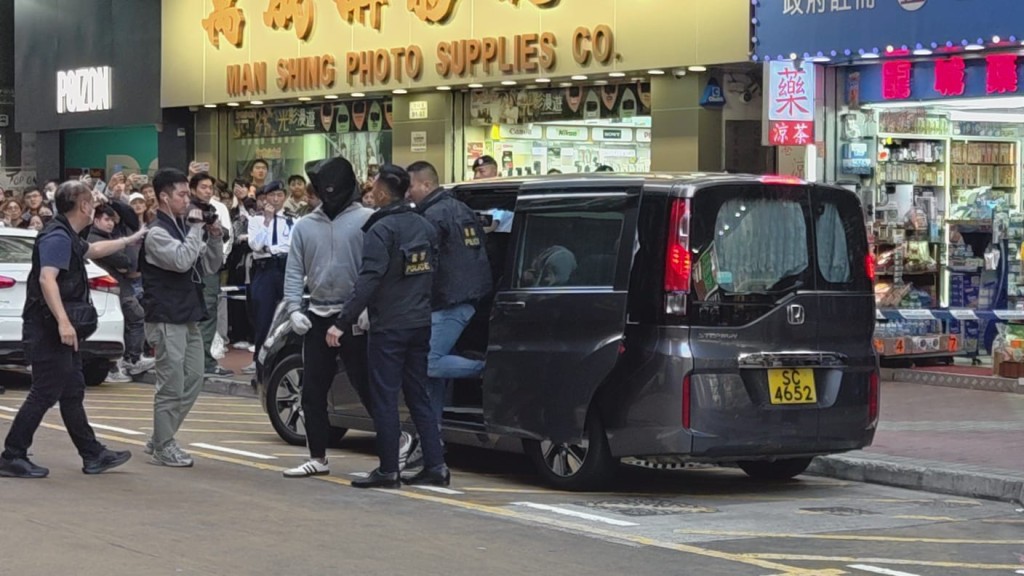 ▲疑犯抵达旺角建兴大厦对开后,回答探员的提问。
