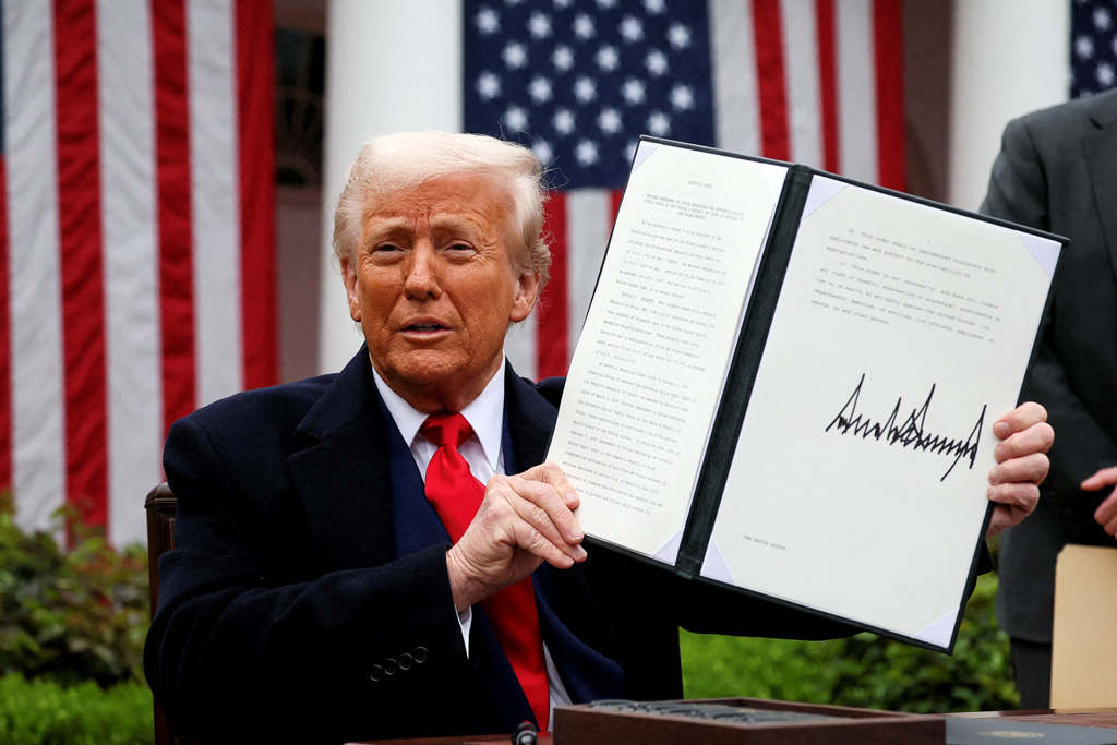 ▲美国总统特朗普2日宣布对台湾课征32%关税,他重申台湾夺走美国芯片产业,尽管台积电赴美投资,但台湾对美国课征68%关税,因此对台湾课32%关税。(路透)