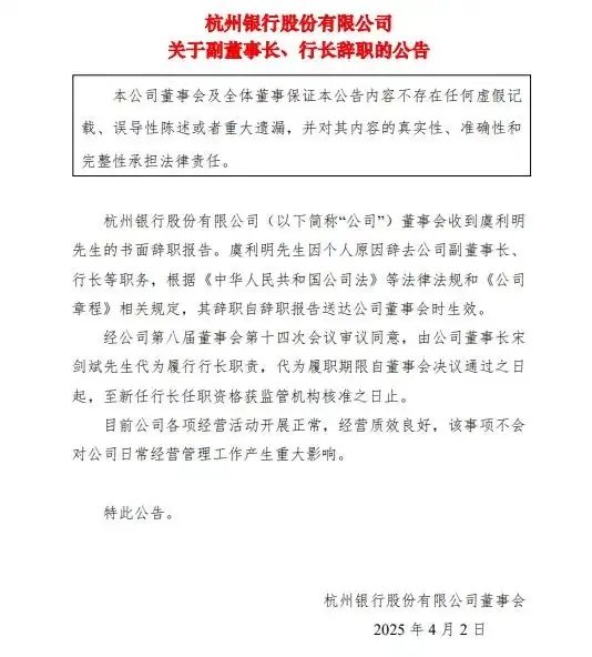 4月2日,有市场消息称,杭州银行股份有限公司(以下简称“杭州银行”)副董事长、行长虞利明疑似失联。当日晚,杭州银行发布公告表示,该行董事会收到虞利明先生的书面辞职报告。虞利明先生因个人原因辞去公司副董事长、行长等职务,董事长宋剑斌代为履行行长职责。