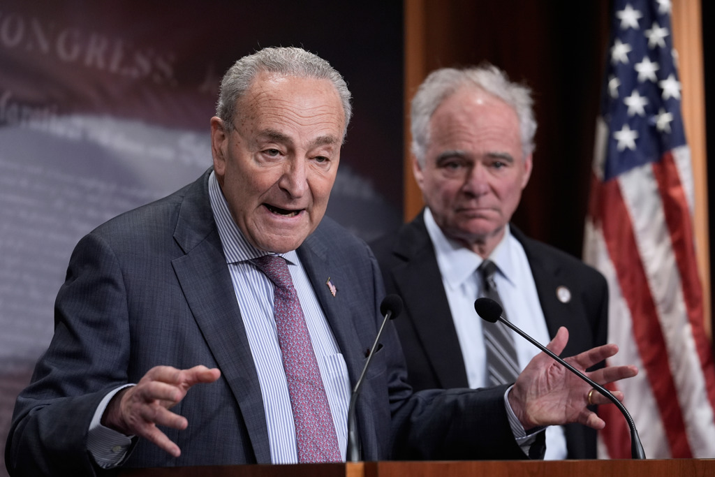 ▲美参议院少数党领袖舒默(左)在特朗普宣布重大关税消息前几小时举行记者会,抨击特朗普的关税“解放日”。(美联社)