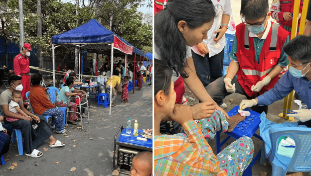 缅甸实皆省发生7.9级大地震,造成重大人命伤亡和基础设施损毁。 特区救援队今日(4日)在缅甸曼特勒地震灾区继续搜救行动,保安局在社交平台facebook表示,特区救援队联同国家队在灾区设置帐篷义诊,多名受伤灾民前来求助,救援队带同合适医疗装备,例如量度维生指数仪器、处理伤口的消毒用品等,协助灾民处理伤员及提供药物。