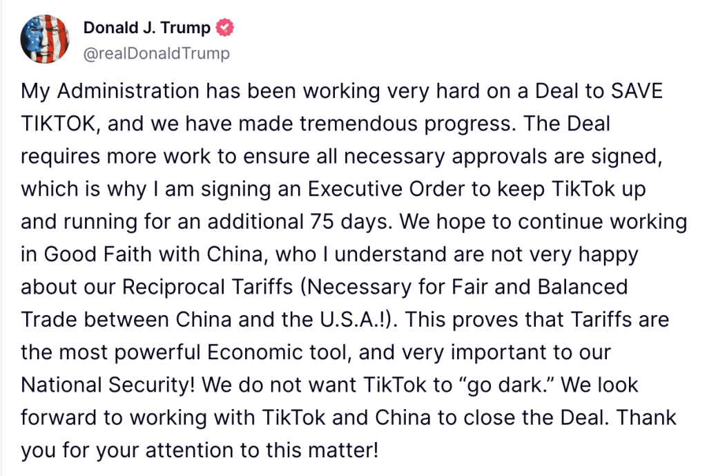 不过,在特朗普宣布征收对等关税后,中国表示不会批准该交易,因此剥离TikTok美国资产的交易被搁置。特朗普于是在4日宣布延长TikTok禁令宽限期75天。