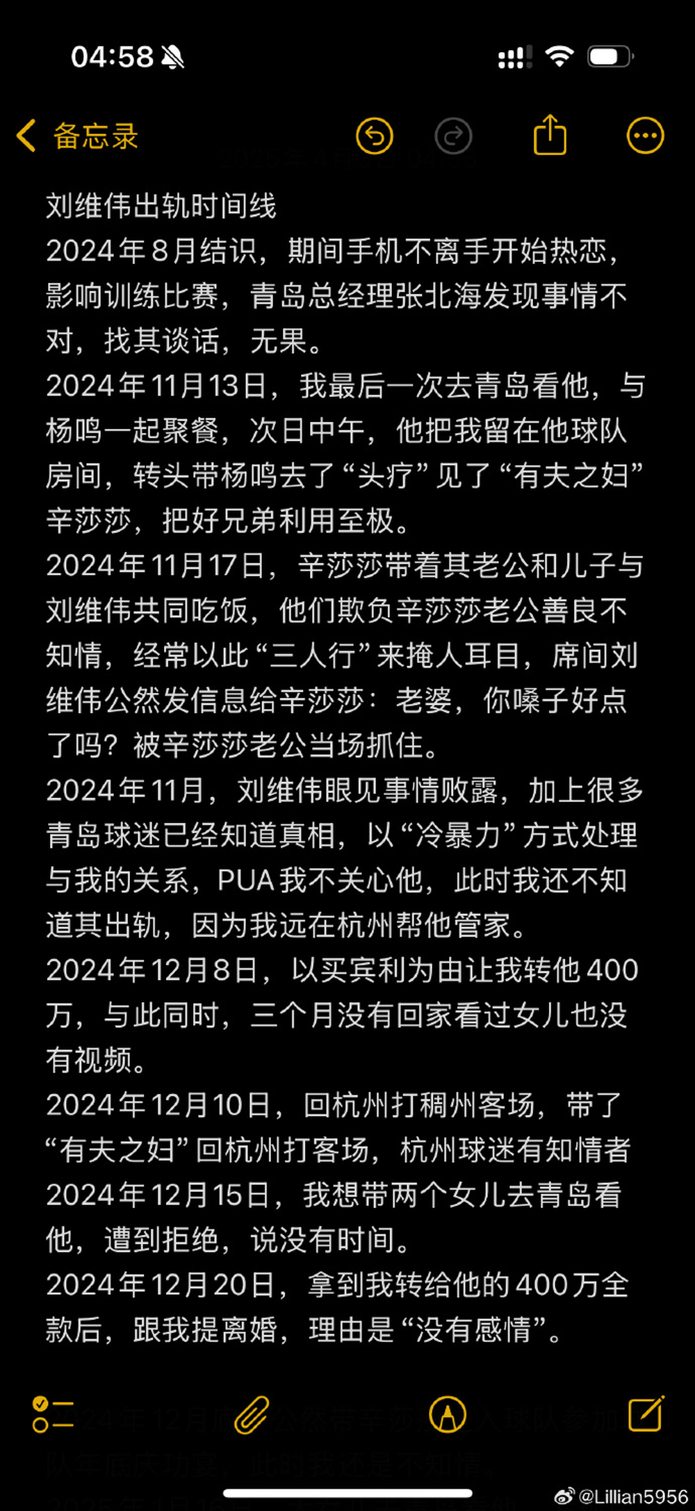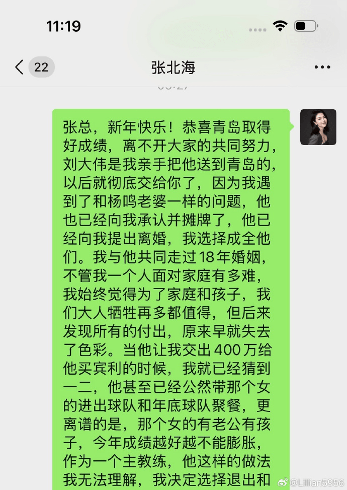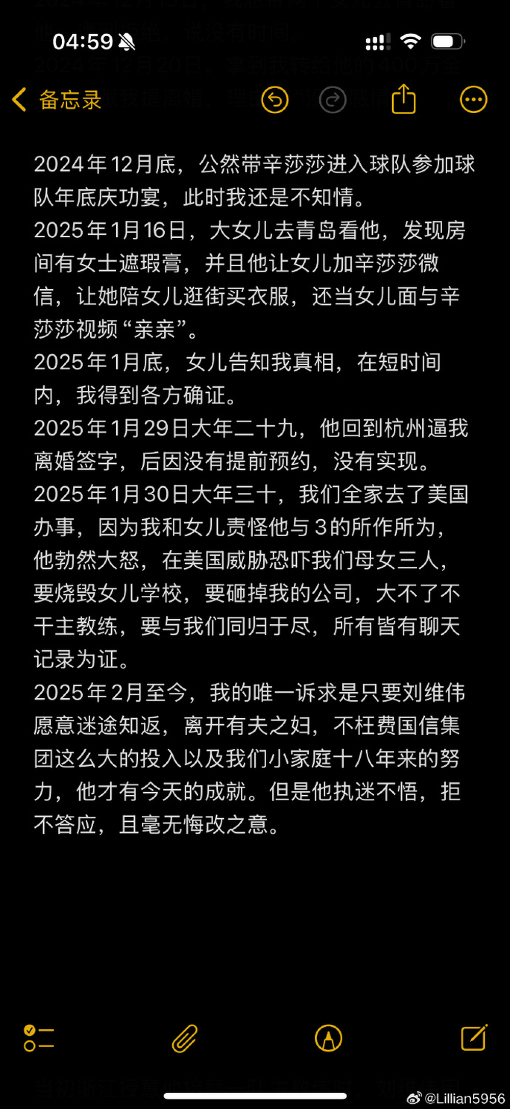 CBA青岛国信海天男篮主教练刘维伟的妻子李艳在个人社交媒体上爆料,称刘维伟公然带着人妻“小三”辛莎莎出入球队,甚至当着女儿的面与小三视频“亲亲”。刘维伟不仅长时间未回家,还恐吓要砸妻子公司,放火烧女儿的学校,并在以购买宾利汽车(Bentley)为由要她转了400万(人民币,下同)后,在过年前逼她签字离婚。而刘维伟出轨,青岛男篮总经理张北海和辽宁男篮主帅杨鸣都知情。