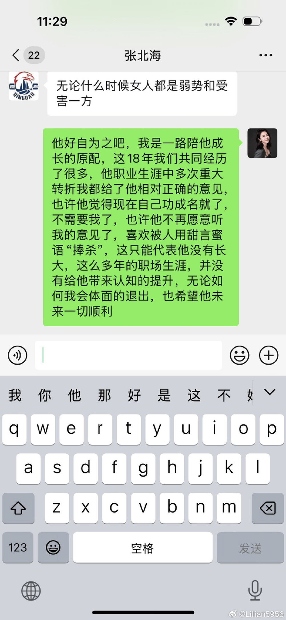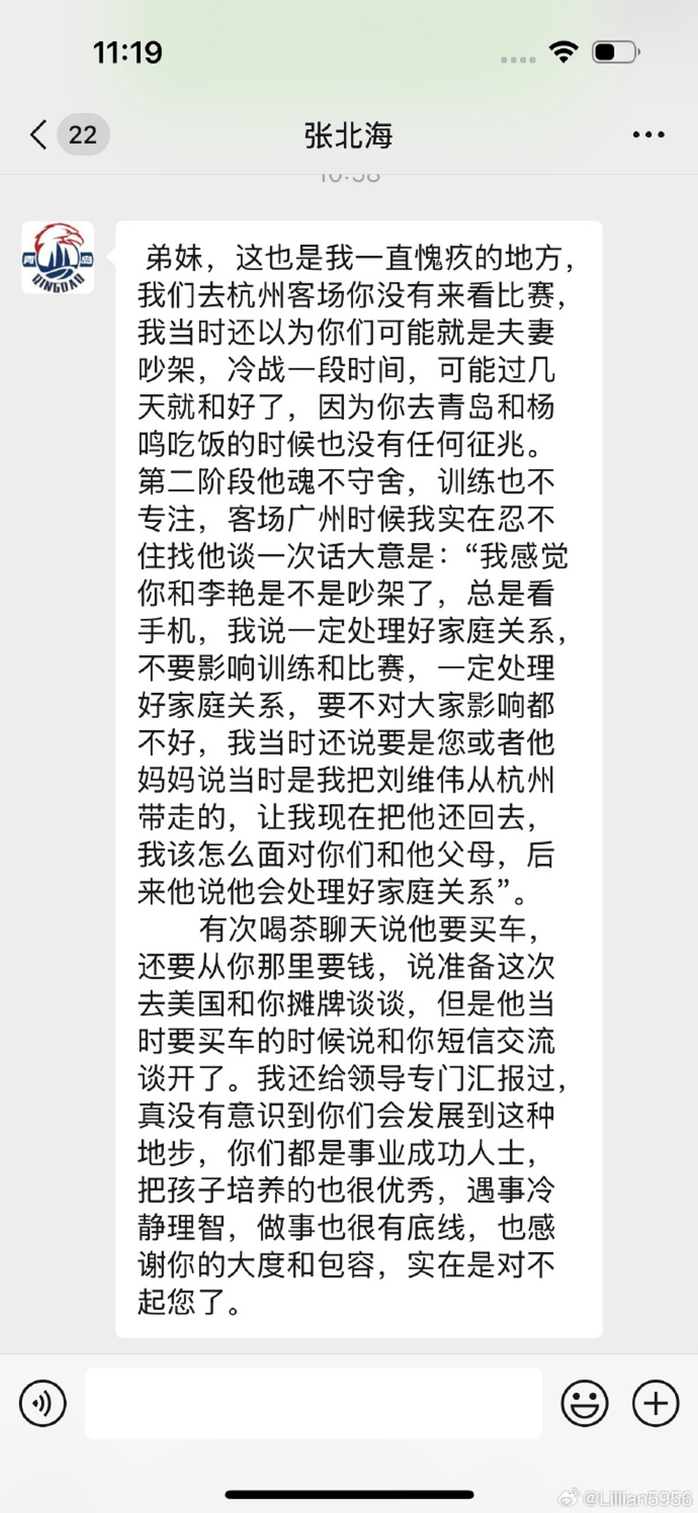 李艳更晒出与青岛男篮总经理张北海的聊天记录。记录显示,张北海承认对刘维伟的行为知情,并表示“很愧疚”“曾多次指责他”。这一信息让外界质疑球会是否对刘维伟的私德问题“只眼开只眼闭”。