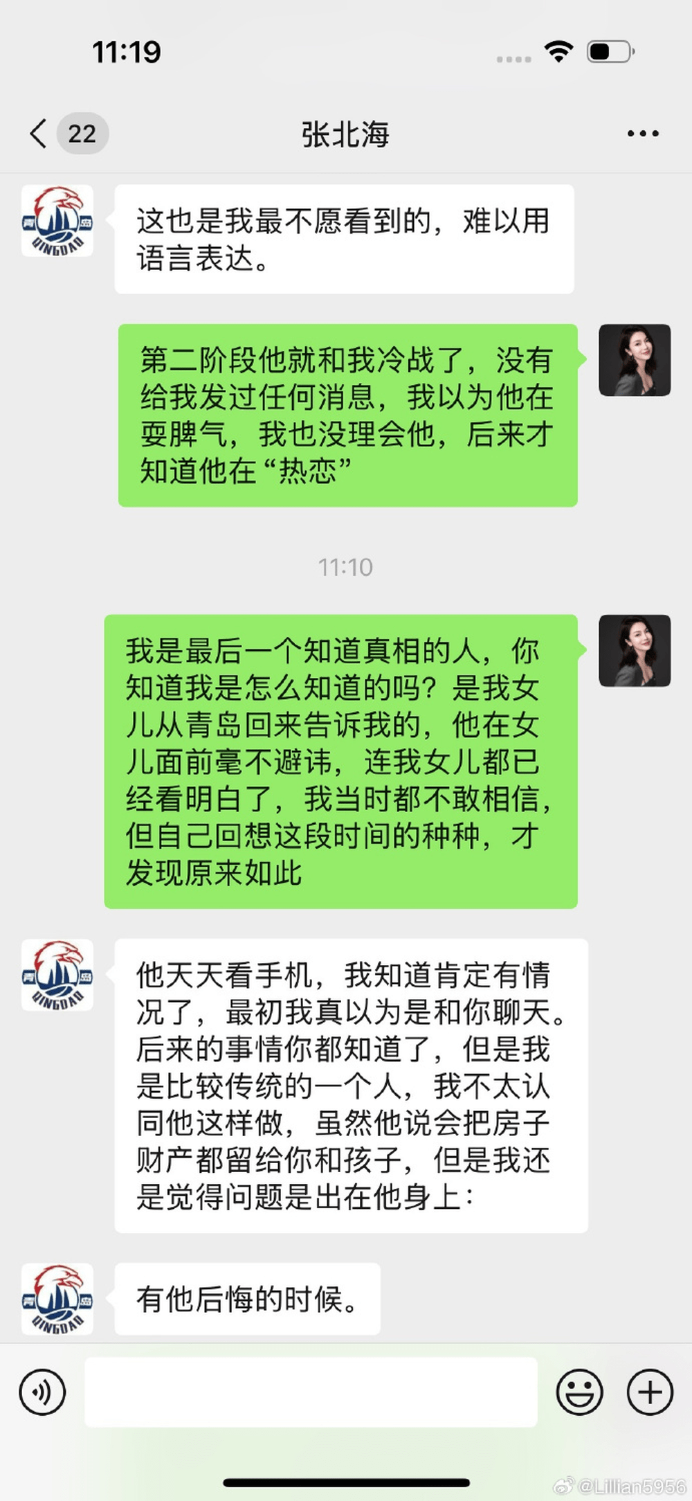 李艳在社交媒体晒出多张图片,其中包括丈夫刘维伟的出轨时间线、夫妻两人之间的微信聊天纪录和李艳与青岛男篮总经理张北海的聊天纪录。