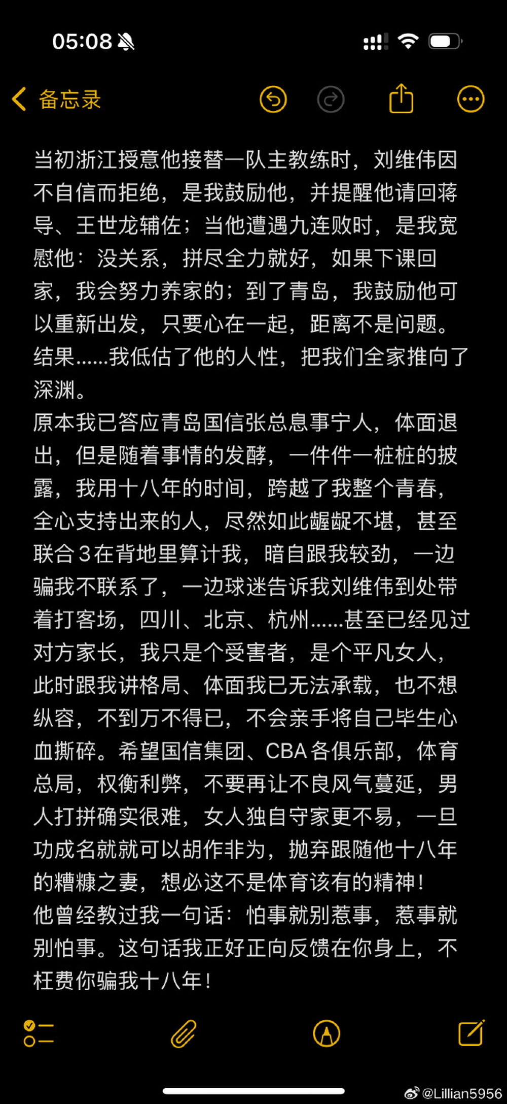 刘维伟是CBA知名教练,曾执教浙江稠州银行男篮,2022年转投青岛男篮。若婚外情及威胁家人等指控属实,其职业形象恐将受到严重影响。