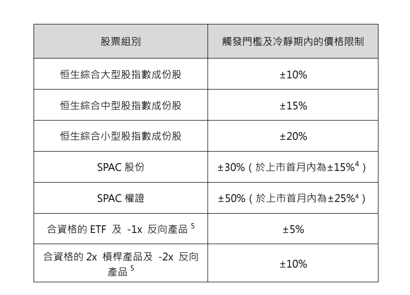 资料显示,机制涵盖所有恒生综合大型股、中型股及小型股指数成份股、SPAC股份、SPAC权证及合资格的交易所买卖产品(ETP)。若标的价格在特定时间内偏离超过预定的百分比(由5%至50%不等,见图),会触发一个5分钟的冷静期,为投资者提供一个“喘息”机会,有助于在市场波动下重新建立有序的市场。