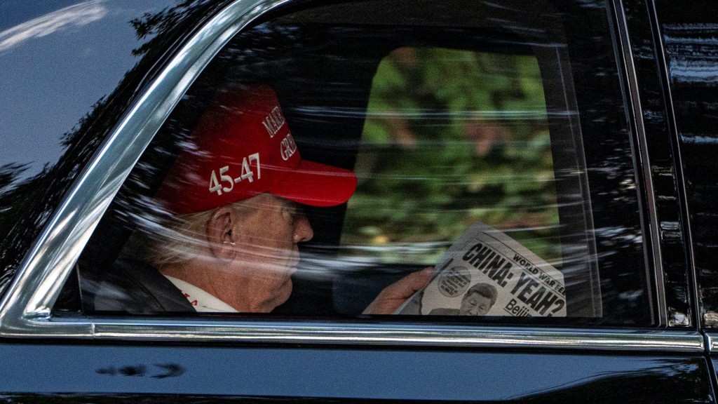 ▲特朗普抵达高球场时,在车上看《纽约邮报》。 美联社