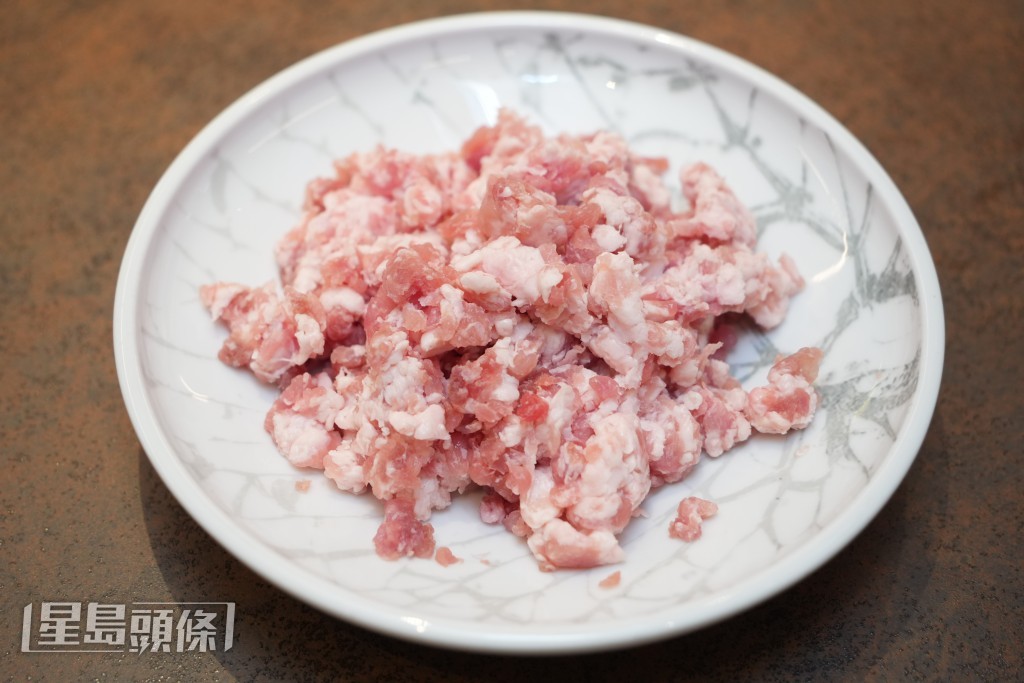 5.手切猪肉成碎粒,并混合6比4的瘦肉与肥膏,口感嫩滑富弹性又不太油腻。