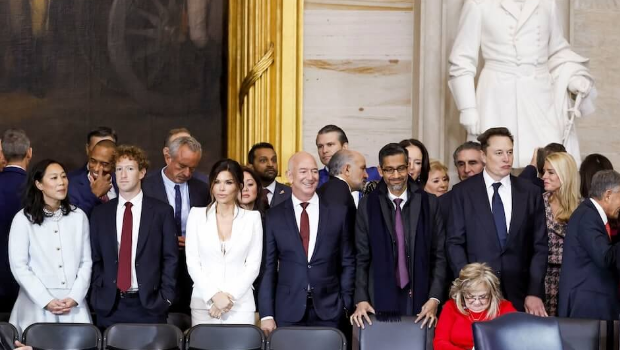 ▲美国总统特朗普1月宣誓就职,脸书创办人扎克伯格(前左2)、特斯拉执行长马斯克(前排站立者右3)、亚马逊创办人贝索斯(前左4)、Google执行长皮查伊(前左5)等人出席典礼。(SHAWN THEW/Pool via 路透社)