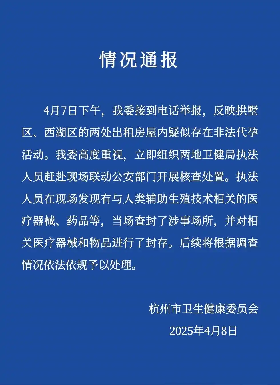 2025年4月8日,杭州市卫生健康委员会就“网传杭州市拱墅区、西湖区的两处别墅内疑似存在非法代孕活动”发布情况通报。