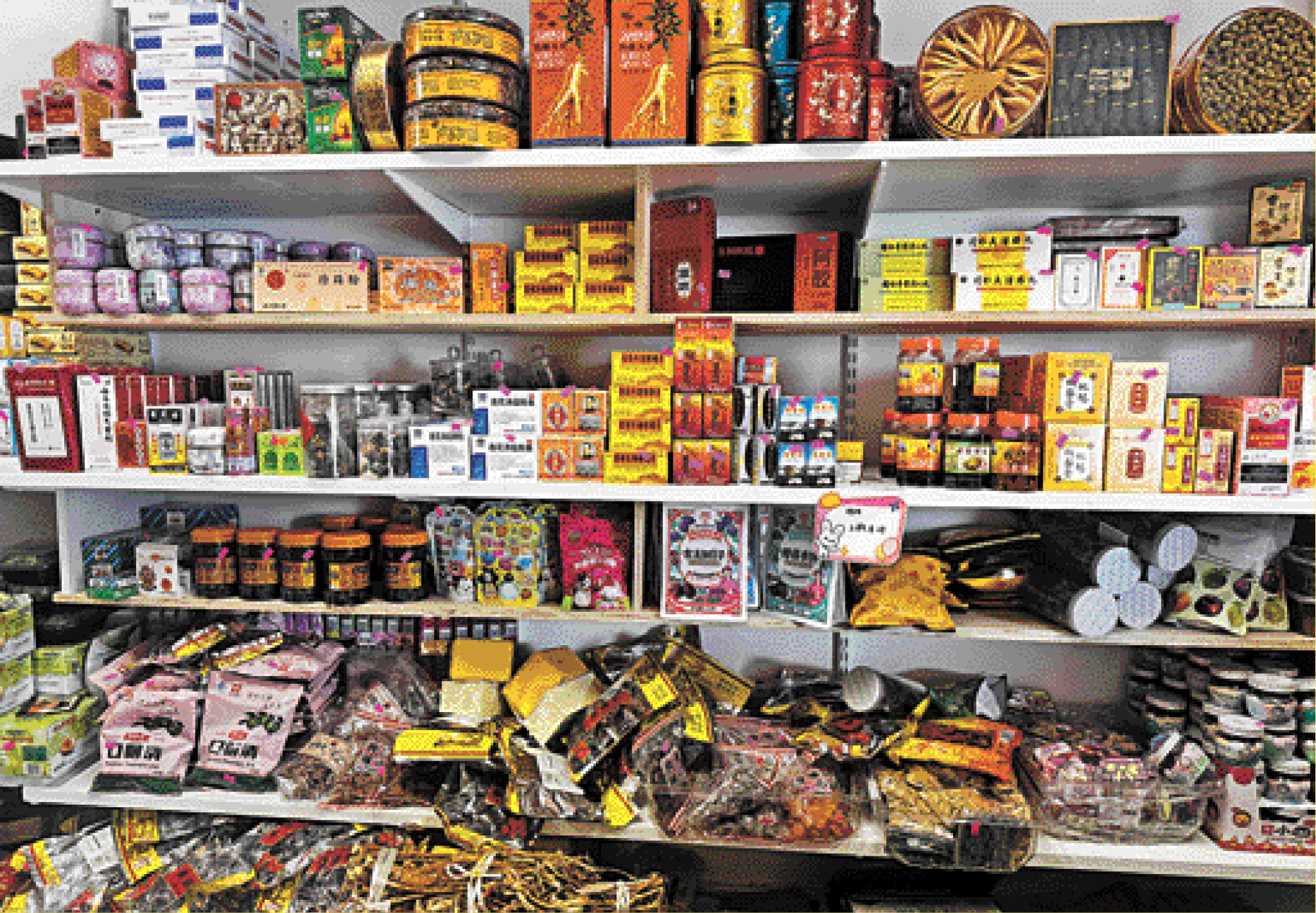 ▲日落区某杂货店,店内大多数的中成药、海味干货和零食等商品都来自中国。