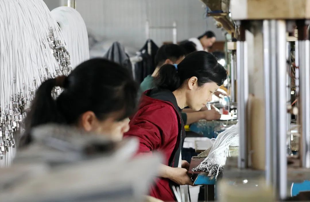 ▲广西柳州一家电子厂生产车间,工人在生产线上加工数据线等电子产品。