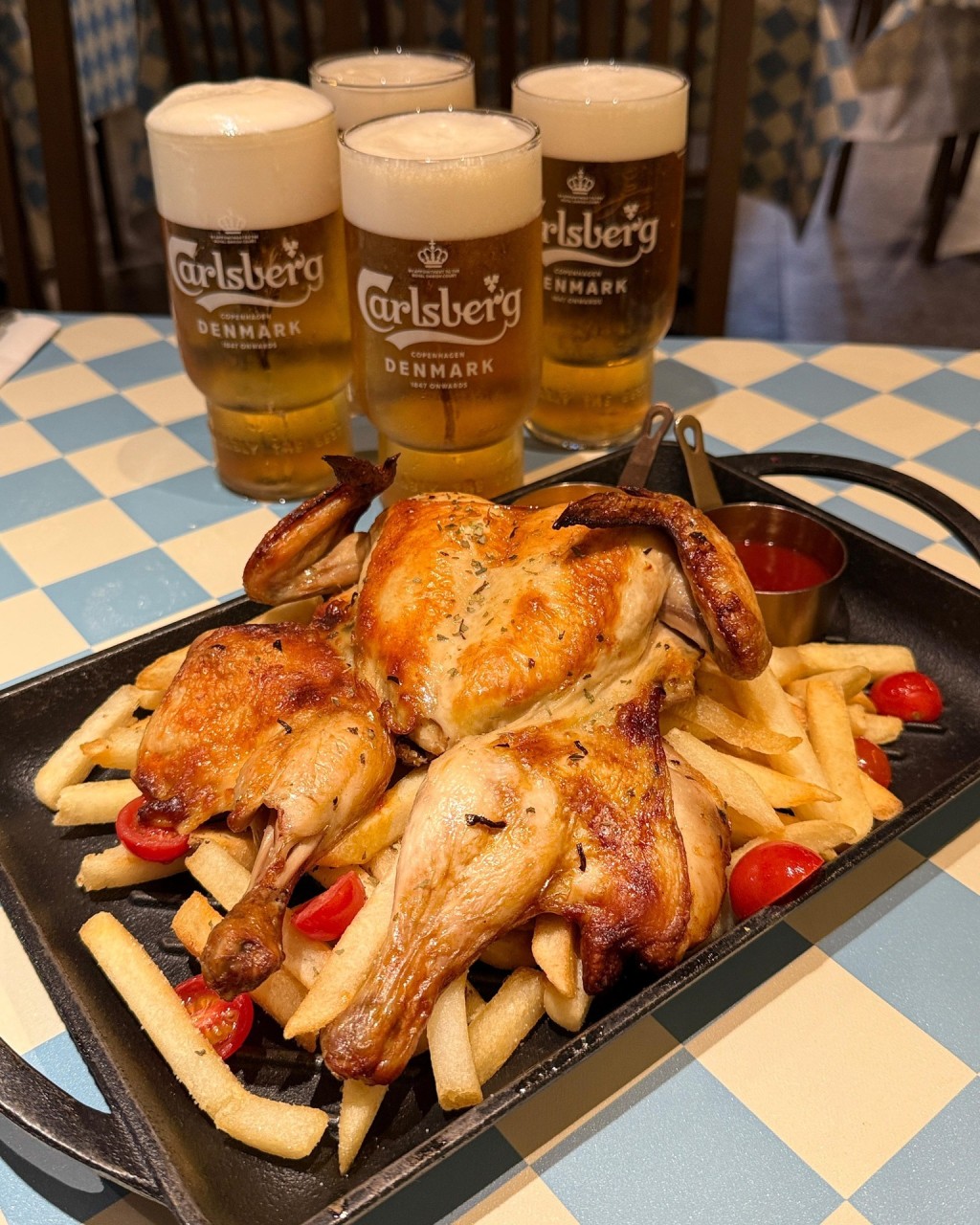 餐厅供应的丹麦式烧鸡选用原只烧鸡,以独家秘制腌料充分入味,再经高温烘烤,使外皮呈金黄酥脆、肉质嫩滑。每份烧鸡搭配香脆薯条,配上一杯冰冻嘉士伯生啤,绝对是下班放松或假日聚会的绝佳选择。