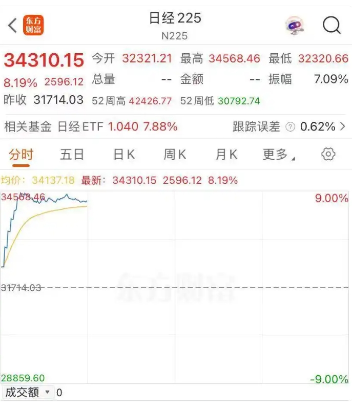 4月10日,日韩股市大幅高开,截至发稿日经225指数大涨超8%,一度涨超9%,日本东证指数涨超8%。