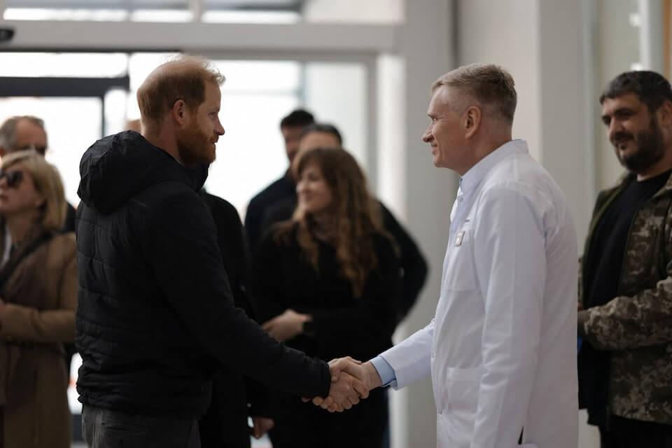哈里到访利沃夫市的骨科诊所“超人中心”(Superhumans Center),此诊所专为受伤军人和平民提供照护与复健服务。