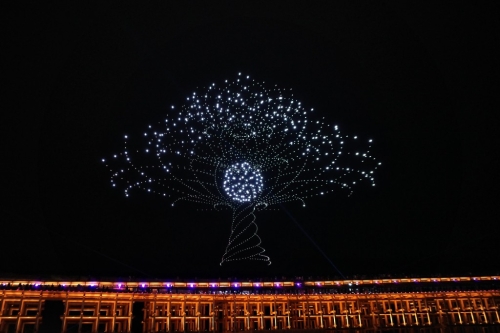 每日傍晚于互动表演区有1,000架无人机升空表演,结合音效、照明与AR投影的户外展演,带来震撼视觉与听觉体验!
