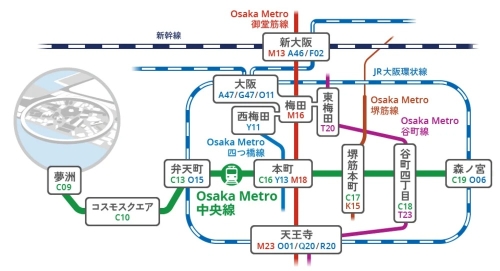 大阪Metro中央线已于2025年1月开设新站“梦洲站”,可直达大阪世博场馆。若从大阪市区出发,可搭乘地铁御堂筋线及中央线前往“弁天町”,再转乘延伸至梦洲站的北港科技港线;若从关西国际机场出发,则可搭乘南海电铁至难波站后换乘大阪Metro中央线到梦洲站,总车程约70分钟,下车后经东门入场。