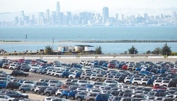 ▲图为美国加州旧金山湾的停车场,停满了新车。路透社