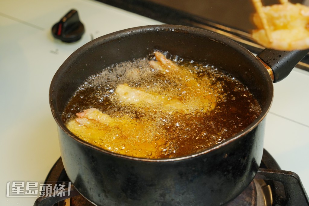 将虾放进约70度的热油中,炸至金黄色,取出。
