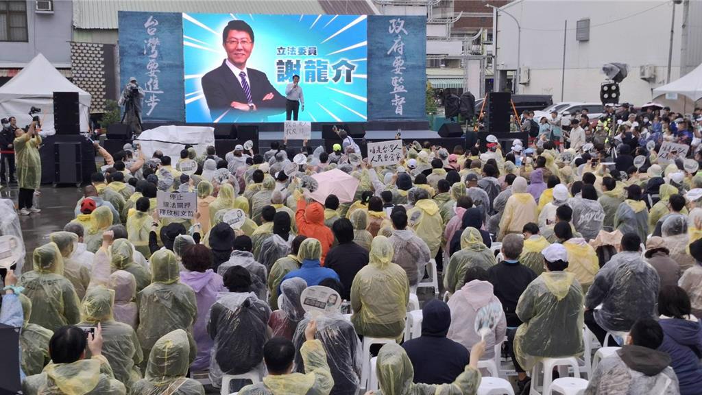▲国民党台南市“立委”谢龙介13日到永康武龙宫参加民众党“人民要当家,全民问政宣讲”活动,一上台获热烈欢呼。