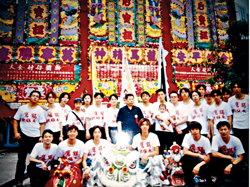 ▲90年代,钟浩声于表演后,抱着儿子跟欧绍永师傅及师兄弟合照。