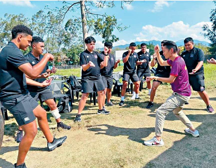 ▲钟浩声向来港交流的新西兰学生,示范舞貔貅。