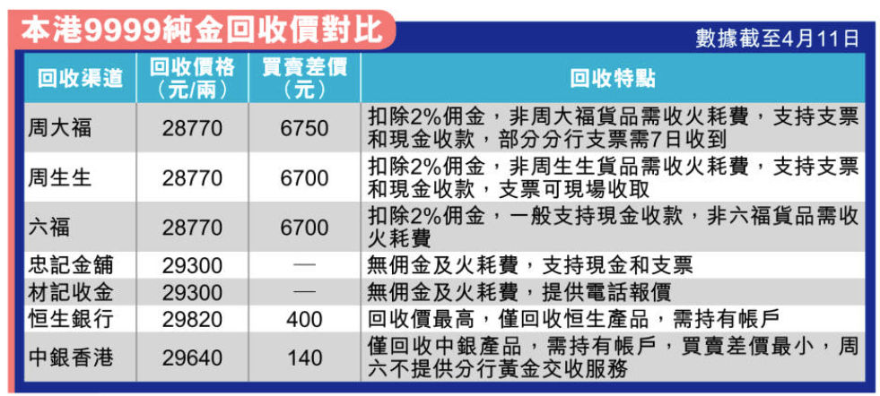 银行虽然黄金回收价最高,但并非来者不拒,只收获香港黄金交易所认证五両或以上的足金金条及自家产品,老字号金铺与连锁珠宝金行均来者不拒,惟后者除了须额外扣除2%佣金,而非自家货品还需额外扣除火耗,故卖金都要格价,随时多一万几千元落袋。